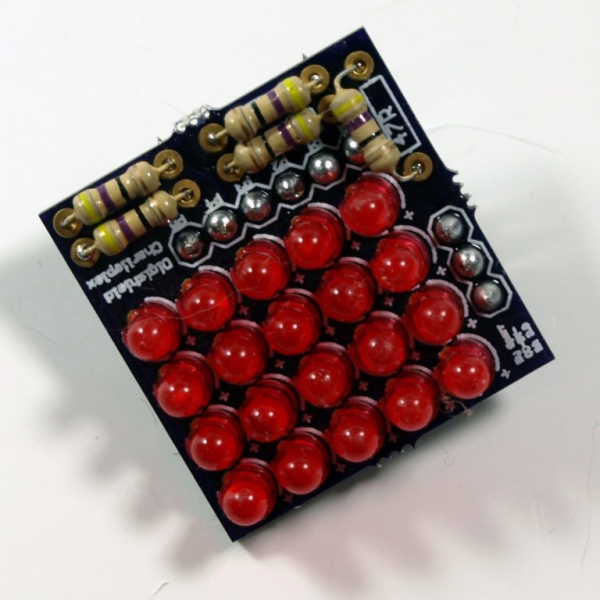 The Charlieplex LED Shield Kit connects 20 red LEDs to the Digispark development board. The LEDs can be controlled through charlieplexing, using rapid changes to make it appear that many are on at one time. This will allow the LEDs to display messages, animations, and more.