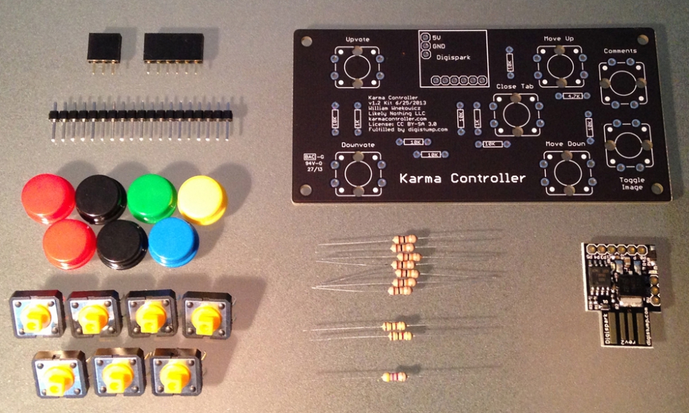 It is a build-it-yourself 7-button USB controller for controlling Reddit.com through the Reddit Enhancement Suite. Karma Controller lets you procrastinate on Reddit more productively. Its 7 buttons are used to up vote, down vote, select posts, toggle images, and open & close comment tabs.