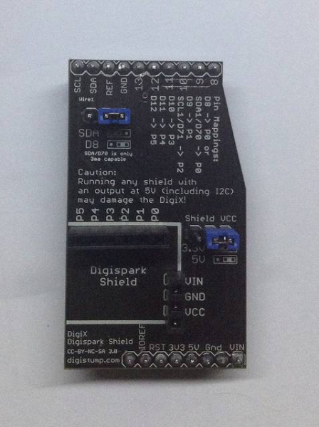 This is an adapter to connect Digispark Shields to the DigiX (or an Arduino Uno R3, or Due). This is a kit and requires the soldering of headers.