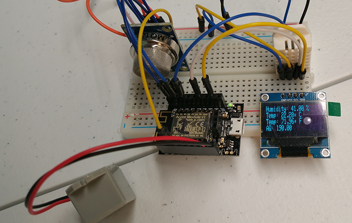 The circuit is fairly straight forward. If you haven't already, go ahead and solder the headers onto your new Oak. Start by plugging the MQ-135 into breadboard and connect the VCC pin to the 5v rail and the GND pin to your ground rail. The MQ-135 has to pins for output, one for digital out and the other for analog out. After doing some testing, I prefer the analog out since it gives you a range of values from 0 to 1024 while the digital one simply gives you 0 or 1 based on the setting of its potentiometer. The main thing to keep in mind with the MQ-135 and most of the other gas sensors is that they need a burn-in period of at least 12 hours. That is because they contain a tiny element which gets hot and then uses that to read the values. Also, when you turn on your new Oak Smoke Detector+ after being off for any length of time, it will require a few minutes to stabilize before the readings are accurate again. Connect the AOut pin of the MQ-135 to the analog pin of the OAK (A0). Next, plug the DHT-22 temperature and humidity sensor in the breadboard and run pin1 to the 5v rail and pin4 to the GND rail. Between pin1 and pin2, place a 4.7K resistor. From pin2, run a lead to pin5 on the Oak. If you are using the 128×64 OLED display, connect VCC to the 5v rail and GND to the ground rail. We will be using i2c in this project so connect SCL to the SCL pin on the OAK and SDA to the SDA on the Oak. Connect the black wire of your buzzer or piezo to the GND rail and the red wire to pin6 of the Oak. Lastly, connect the Oaks VIN and GND pins to the appropriate rails on your breadboard and you are almost ready. All you need now is a power supply to your breadboard power rails that will give you a steady 5v and nothing more. Once you connect the power, your MQ-135 will start to warm up and your Oak will connect to your wifi. Now its time to program!