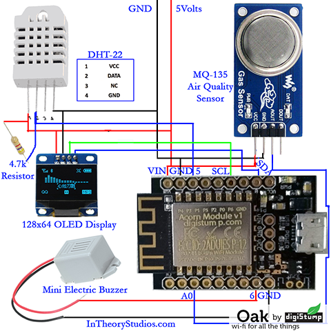 Because of a fire at my house where the existing (6 month old) smoke detectors didn't even go off, I decided to build a better set of detectors which do far more than just detect smoke. This design features the mighty Oak with its built in wifi and Particle.io ability to communicate with the world. It includes a MQ-135 air quality sensor which not only senses smoke but also other harmful fumes and gases. It also has a DHT-22 temperature and humidity sensor to give constant feedback to the state of the enviroment. And it has an alarm which goes off when a specified threashold is reached. All of this data can then be pulled from the Oak into Particle.io where it can be accessed by ifttt.com, thingspeak.com or any other monitoring site including one you create yourself. I currently have mine populating several graphs from thingspeak.com which can be viewed here… http://www.intheorystudios.com/oak1 And when the alarm threashold is reached, I get a text message on my phone from ifttt.com I love the Oak and how quickly I was able to bring this design to life. Thanks Digistump!