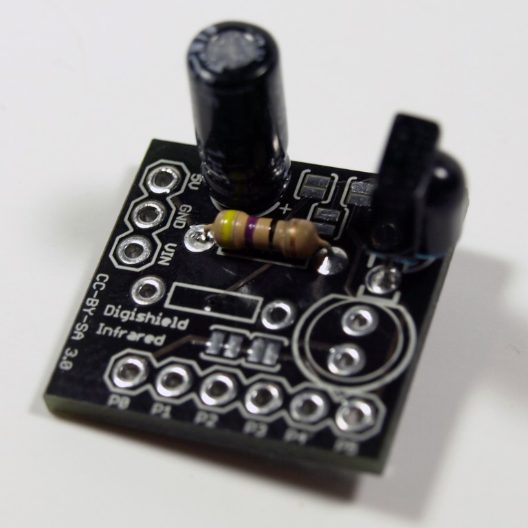 The Infrared Shield Kit allows you to connect a infrared receiver with the Digispark development board. The Infrared Shield connects the TSOP382 IR Receiver Diode to the Digispark allowing the Digispark to receive signals from standard TV remotes. The Infrared Shield circuit board also includes support for adding an Infrared LED for transmitting IR signals, thought the LED is not included.