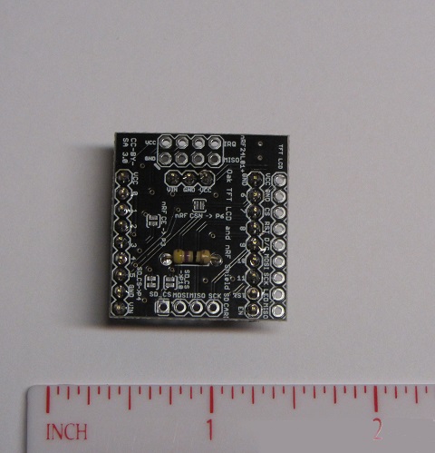 Cut or Snap a length of two male headers 9 pins long and one 3 pins long. Insert into corresponding positions (on the bottom of the board) and solder each pin. Be sure to leave the row of holes on the edge of the board open where there are two sets of 9 holes. This is where the TFT screen is soldered.