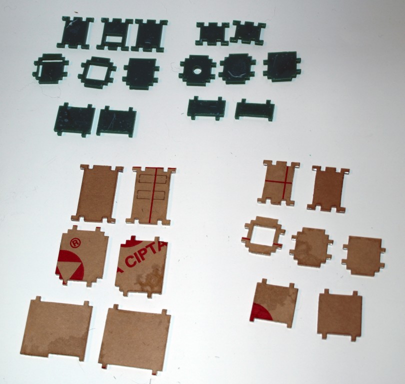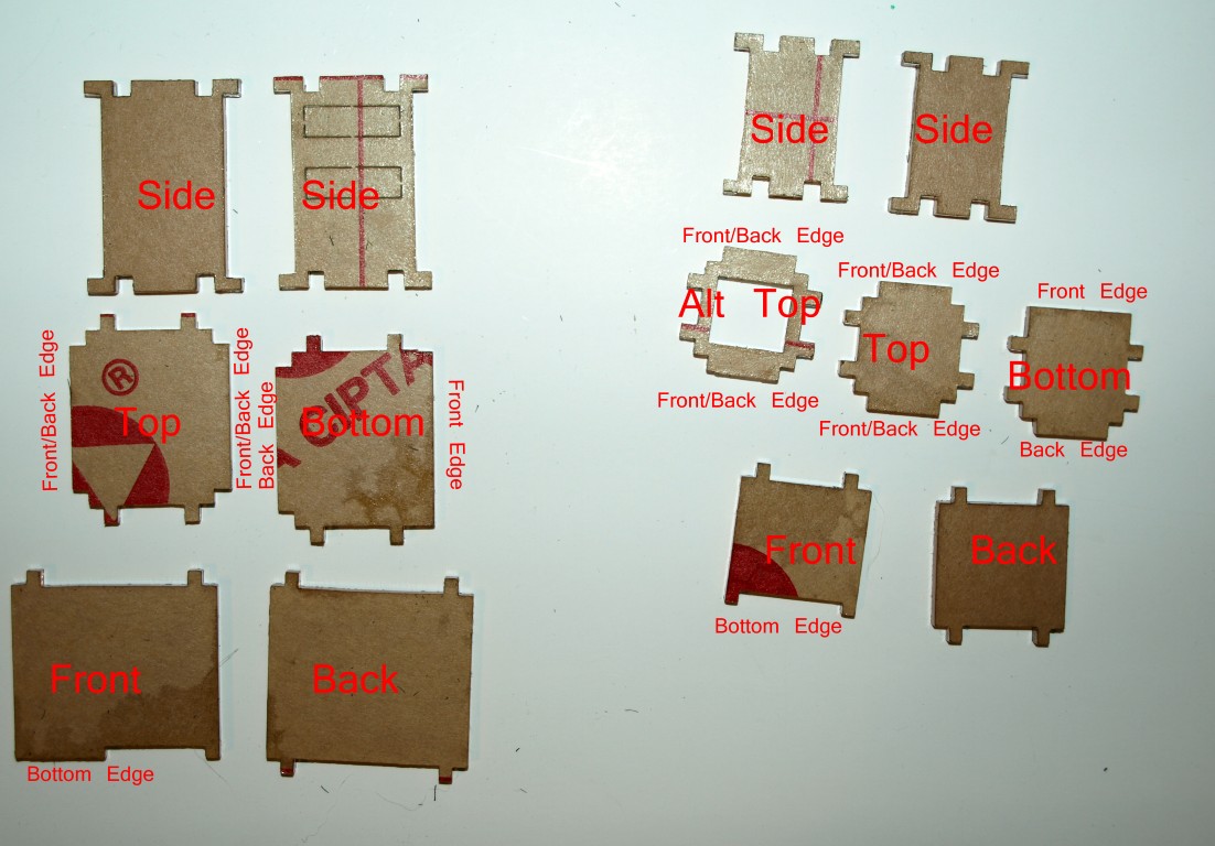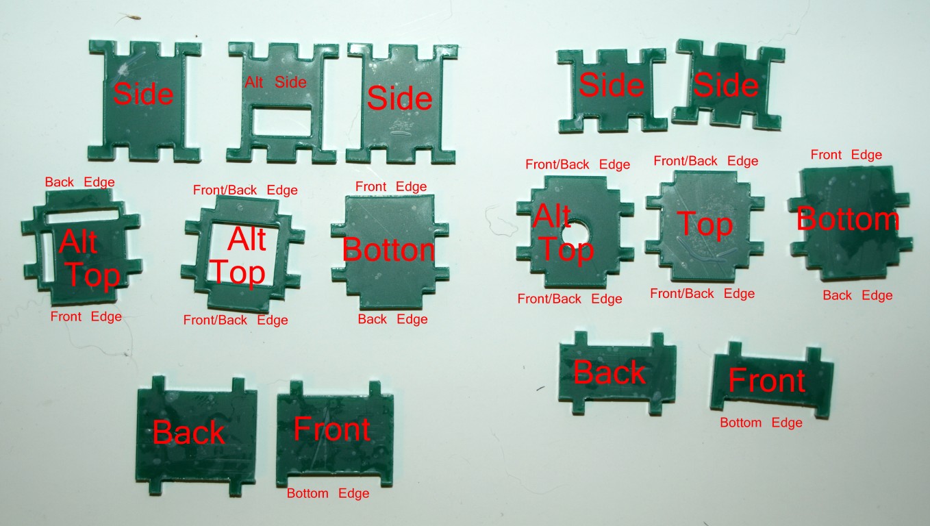 To help assemble them here are the pieces labeled. Some sides and tops have alternative versions (for LED, for header access, for wires to leave the case, etc).