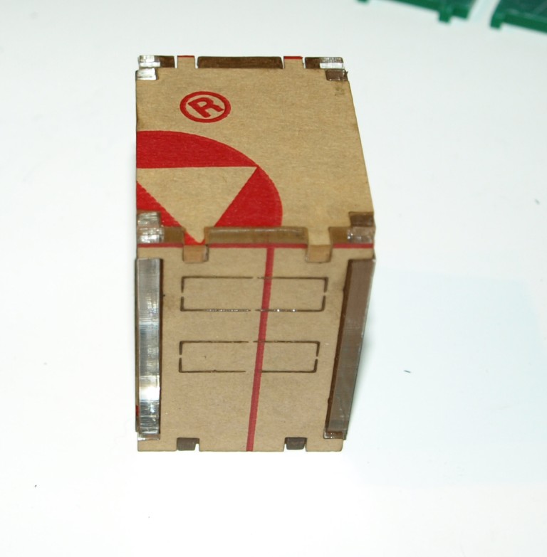 The front and front edge of the bottom piece leave a gap, this is where the Digispark USB port can exit - with some of the larger cases (and even the smaller ones) you may want to glue a small piece of acrylic scrap to the bottom plate to hold the Digispark forward so the USB connector sticks out.