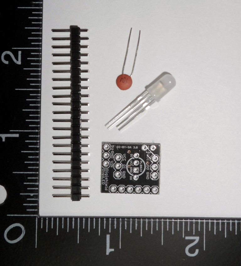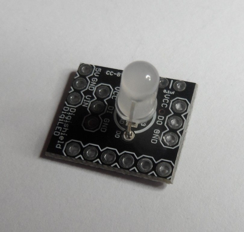 For example, LED #1 would need the top 3 pins VCC, DO (out) and GND to connect to DigiLED #2's VCC, DI (in) and GND on the second row from the bottom of the board.