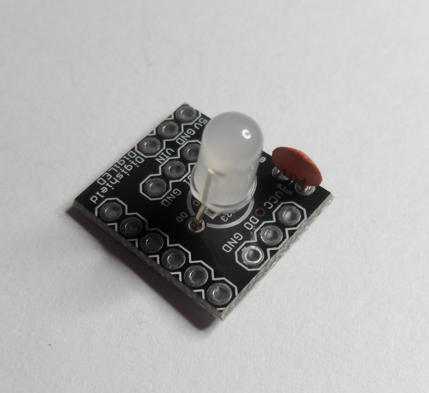 When inserting the LED into the board ensure the two longer leads of the LED goes through the holes marked data out and ground (see photo) - this ensures you have the LED oriented properly. Solder the LED leads and clip off the excess.