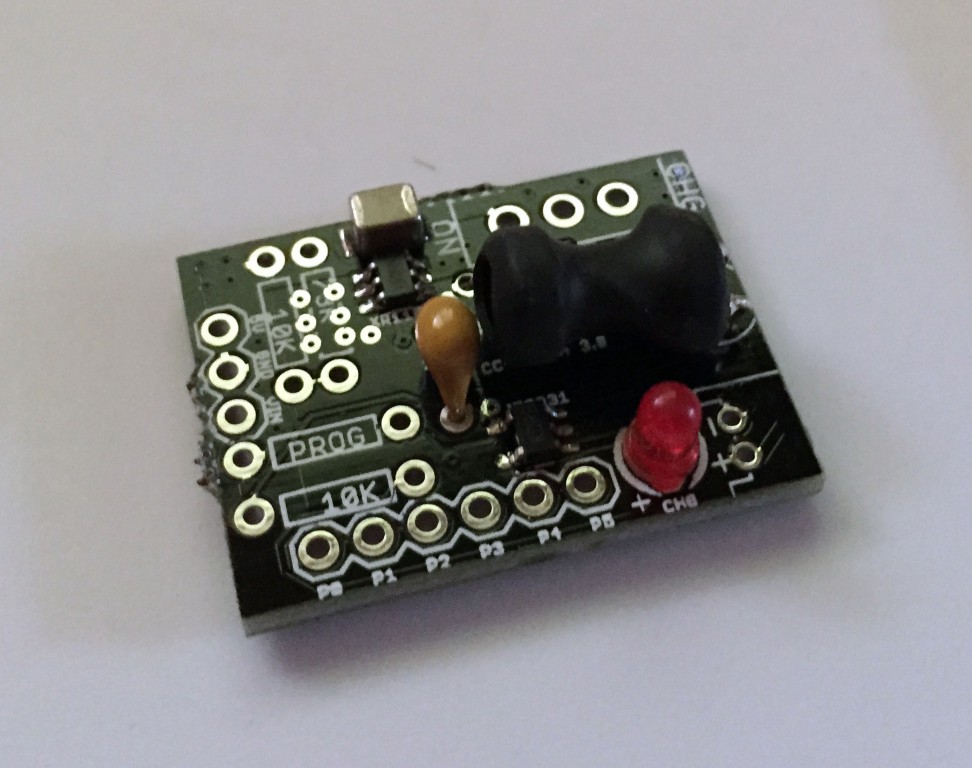 Insert either the 2k or 10k resistor into the Prog spot. Use the 2k for a charge rate of 500ma, use the 10k for a rate of 100ma. If you don't know which to use, we recommend the 10k, it will result in a slower charge, but with less heat and less power draw from the USB/Digispark. Solder the leads and clip off the excess.